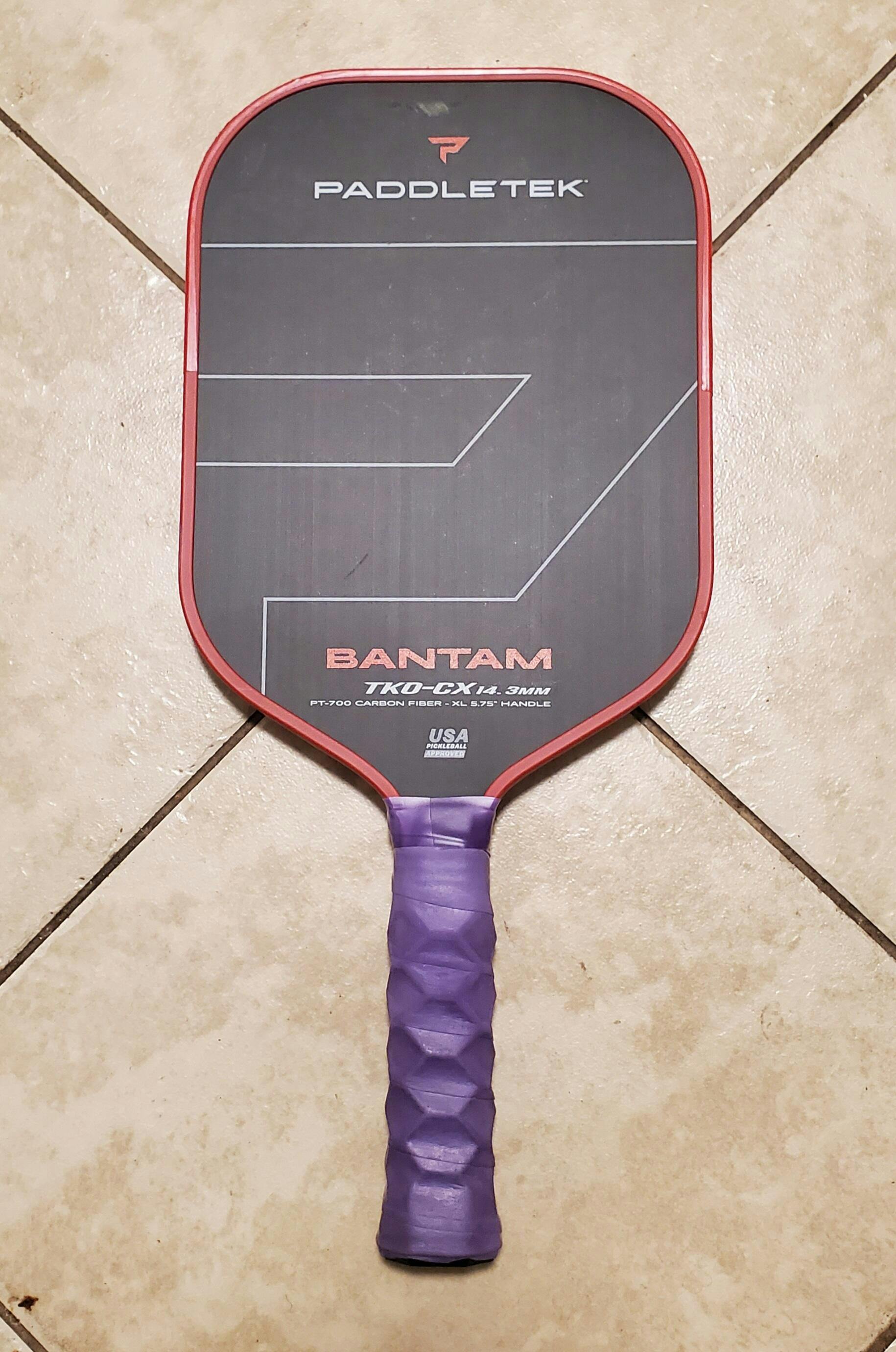 The Bantam TKO-CX (XL handle) was designed in conjunction with top pickleball pro, Christian Alshon, to provide a combination of power, spin, and reach. PT-700 unidirectional RAW carbon fiber is combined with our legendary Bantam core to give serious players max power and spin capability. A 5.75" handle reduces wind drag and allows for a two-handed backhand, while a 16.5" overall paddle length increases speed at the point of contact—exponentially increasing power with every hit.